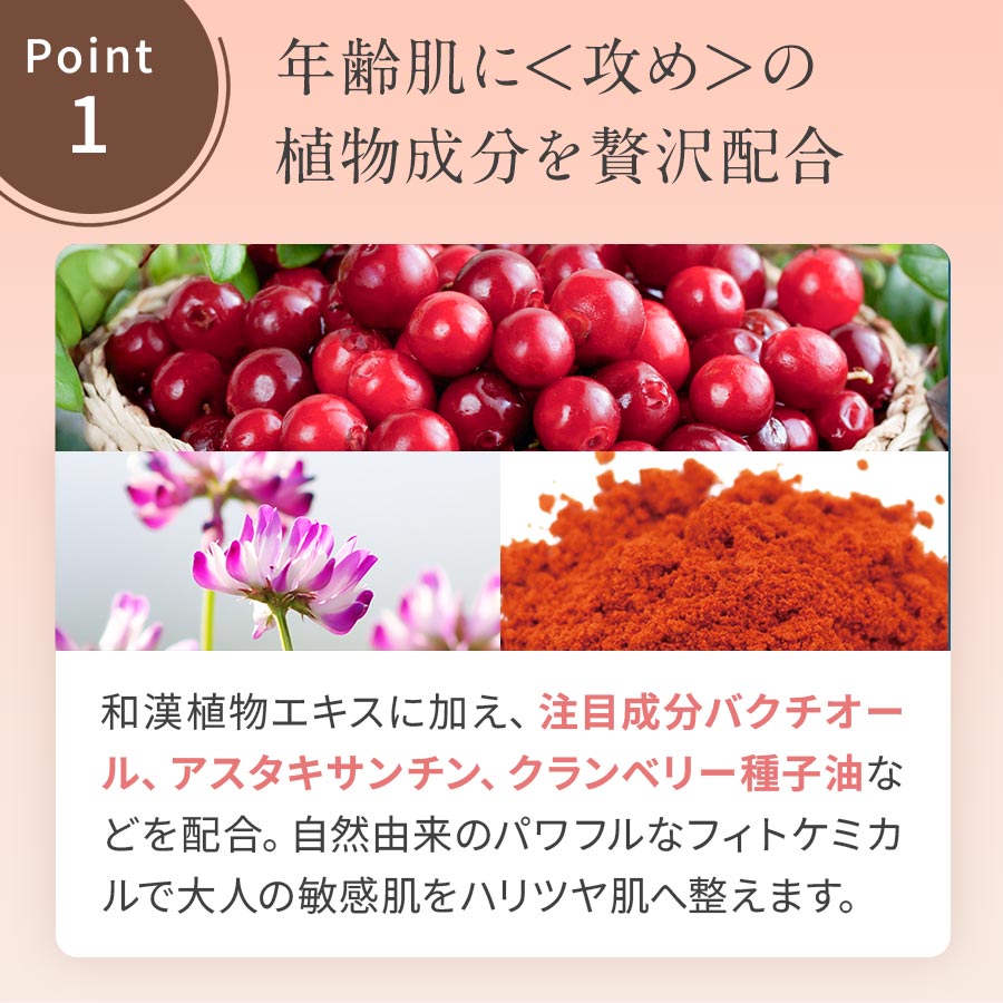和漢植物エキスに加え、注目成分バクチオール、アスタキサンチン、クランベリー種子油などを配合。自然由来のパワフルなフィトケミカルで大人の敏感肌をハリツヤ肌へ整えます。