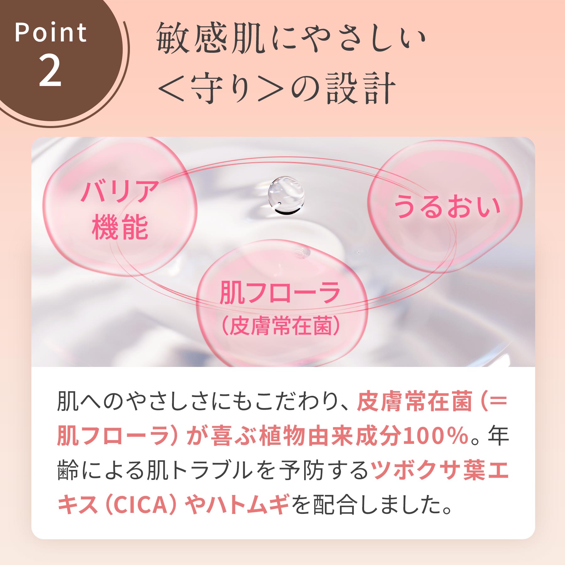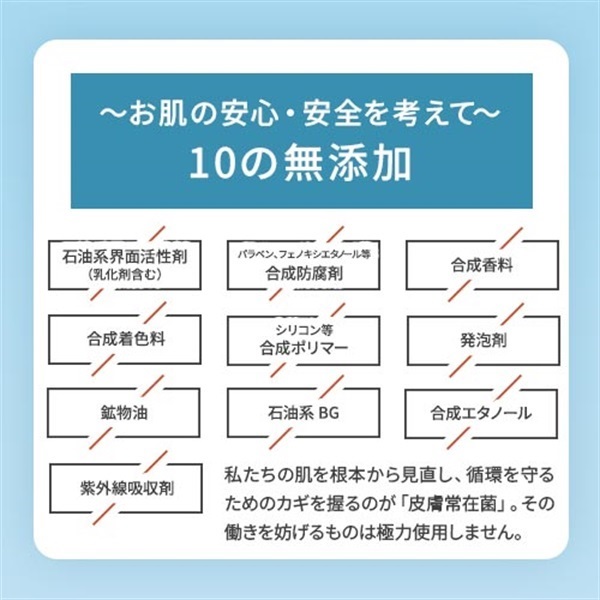 実感と同時に肌へのやさしさにもこだわりました。肌のバリア機能を支える皮膚常在菌(=肌フローラ)が喜ぶ植物由来成分100%。トラブル肌に効果的なツボクサ葉エキス(CICA)やハトムギ種子エキスを配合。さらに発酵由来のヒアルロン酸でうるおいをしっかりキープします。