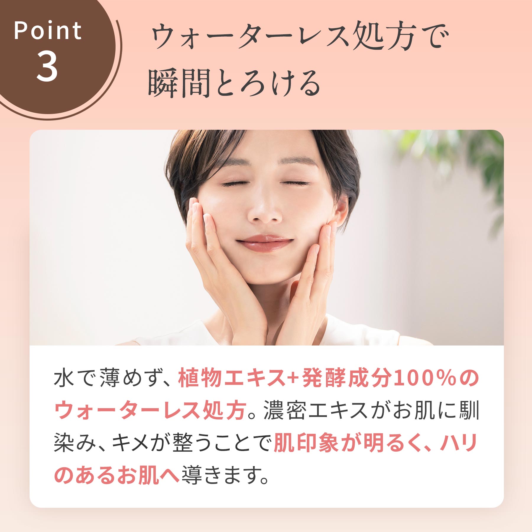 水で薄めることなく、植物エキス+発酵成分100%のウォーターレス処方。ぷるんとした濃密エキスがみずみずしくお肌に馴染み、するすると肌に吸い込まれていきます。水分を抱え、キメが整うことで肌印象が明るく、ハリのあるお肌へ導きます。