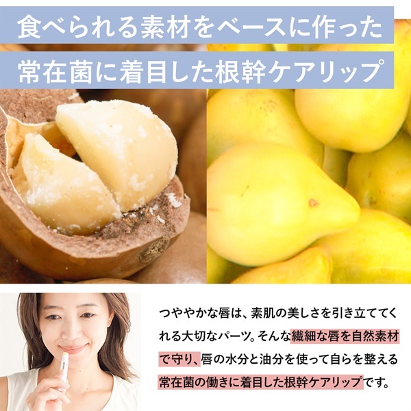 人の皮脂と同じ成分を含むマカデミアナッツオイルが、年齢とともにしわが入り、みずみずしさがなくなる唇をケアし、若々しい印象を与えます。同時に果実のなかで最大のビタミンC含有量を誇り、美肌菌もサポートするスーパーフルーツのカカドゥプラムが、揺らぎがちな肌を整え、繰り返す唇の荒れを防ぎます。