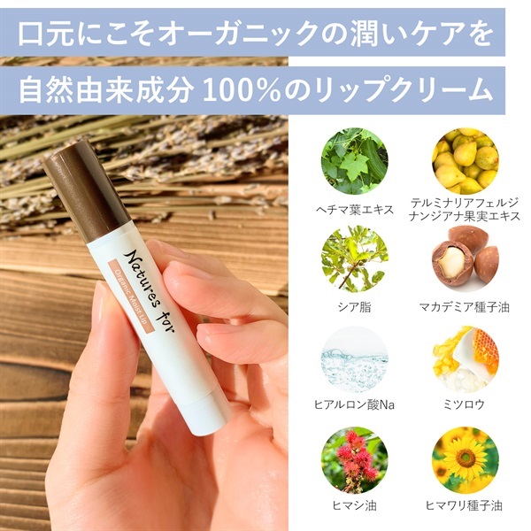 なめらかな使用感と華やかな香りのやさしいリップクリームです。繊細な唇をオーガニック自然素材で潤し、保護。すこやかで、ふっくらと潤う唇へ導きます。