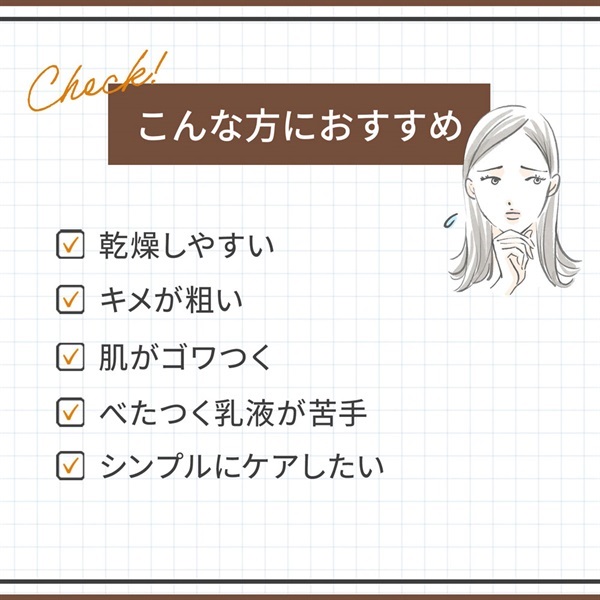 しっかりしっとり感があるのに、サラッとした仕上がりに感動しました。目元、口元には重ねて保湿したらよりしっとりしてとてもいいです。