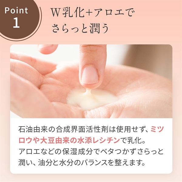 石油由来の合成界面活性剤は使用せず、ミツロウや大豆由来の「水添レシチン」によりやさしく乳化。油分と水分のバランスを整えるとともに、アロエや天然由来の保湿成分で、べた付かずさらっと潤うヴェール感を実現しました。