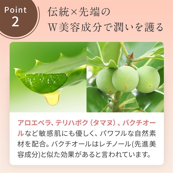 アロエベラ液汁、バクチオール、テリハボク(タマヌ)など敏感肌にも優しくかつしっかり実感できる美容成分を追加。美肌への回復力をサポートします。