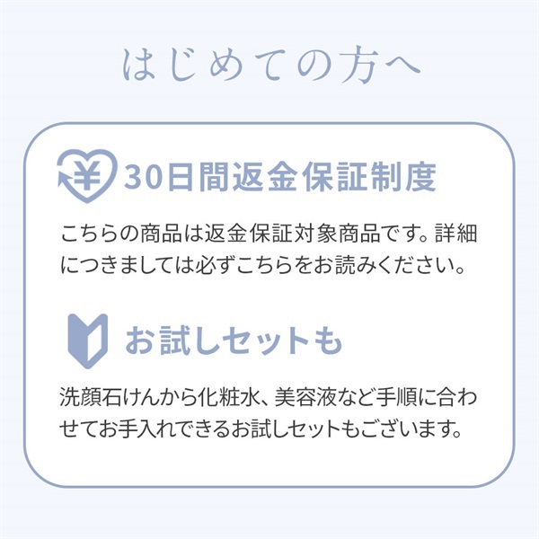 洗顔石けんから化粧水、美容液など手順に合わせてお手入れできるお試しセットです。使用感や肌なじみをお確かめください。