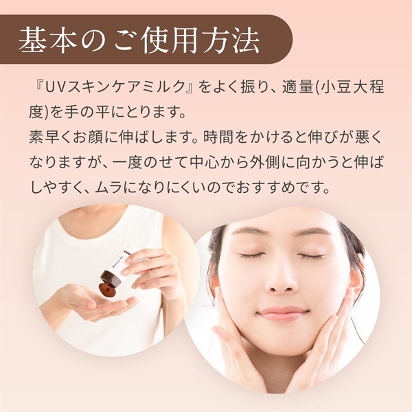 毎日のUV対策をもっと肌にやさしく、もっと心地よく。スキンケア発想だから、水を一滴も使用せず、植物エキスで肌を整えながら、紫外線をカットするオールシーズンのノンケミカルUVミルクです。