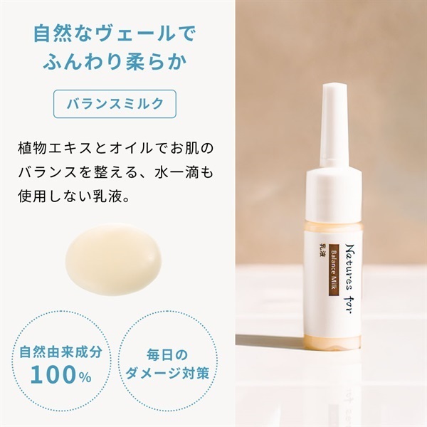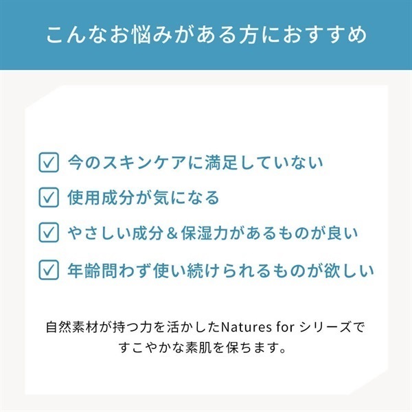 Natures for シリーズはヘチマなどの伝統素材の自然の浸透力を活かしたり、長年の経験と研究を活かしてオイルを独自ブレンドしたりすることで敏感な肌もやさしくケアして心地よくなじみます。