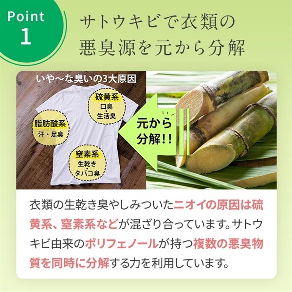 もう一つの特徴が優れた感覚的消臭効果。サトウキビ由来の香気成分がしつこいニオイを包み込み、中和します。また持続力も高いため、洗い立てのようなすっきりとした感覚が長続きします。