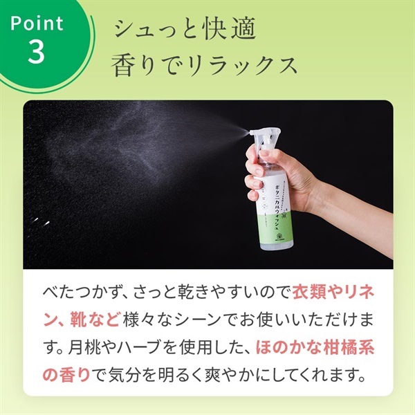 スプレーした後はべたつかず、さっと乾きやすいので衣類やリネン、靴など様々なシーンでお使いいただけます。また月桃やハーブを使用した、ほのかな柑橘系の香りで気分を明るく爽やかにしてくれます。