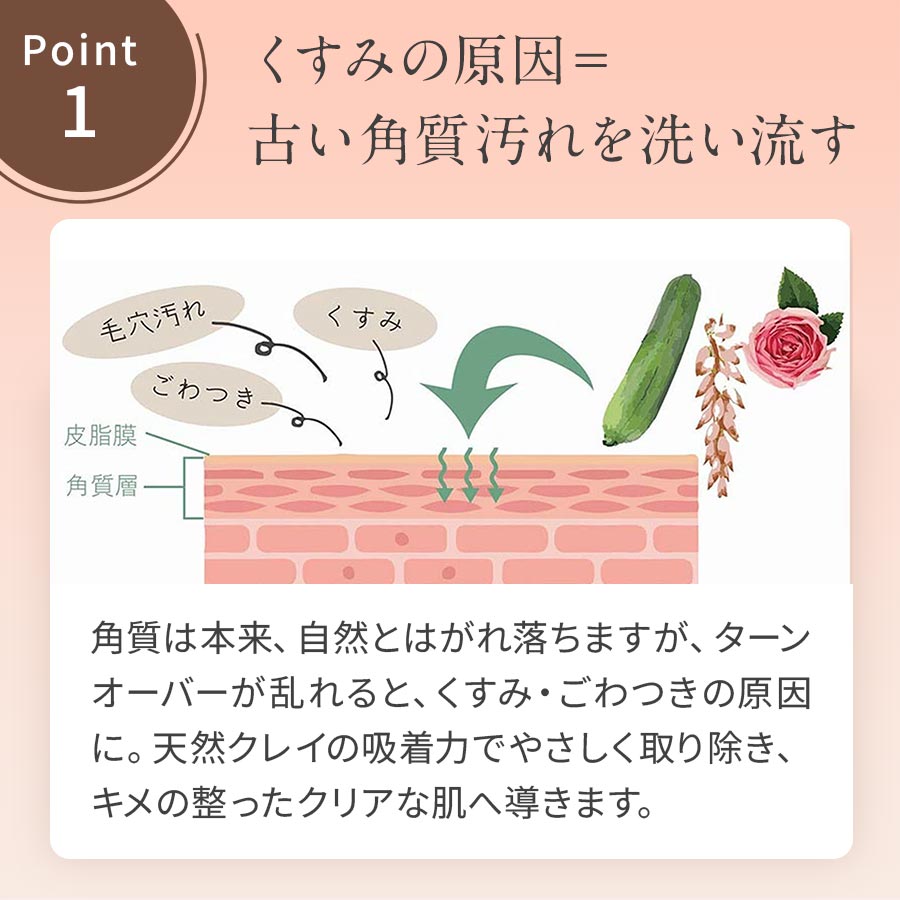 くすみの原因となる古い角質や汚れをクレイが吸着することで、化粧水の入りもよくなり明るいお肌へ。また、落とすだけでなく濃厚な植物エキスで潤いをチャージし、赤ちゃんのようなみずみずしい柔肌へ導きます。