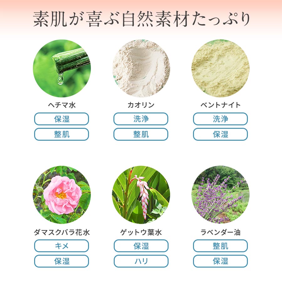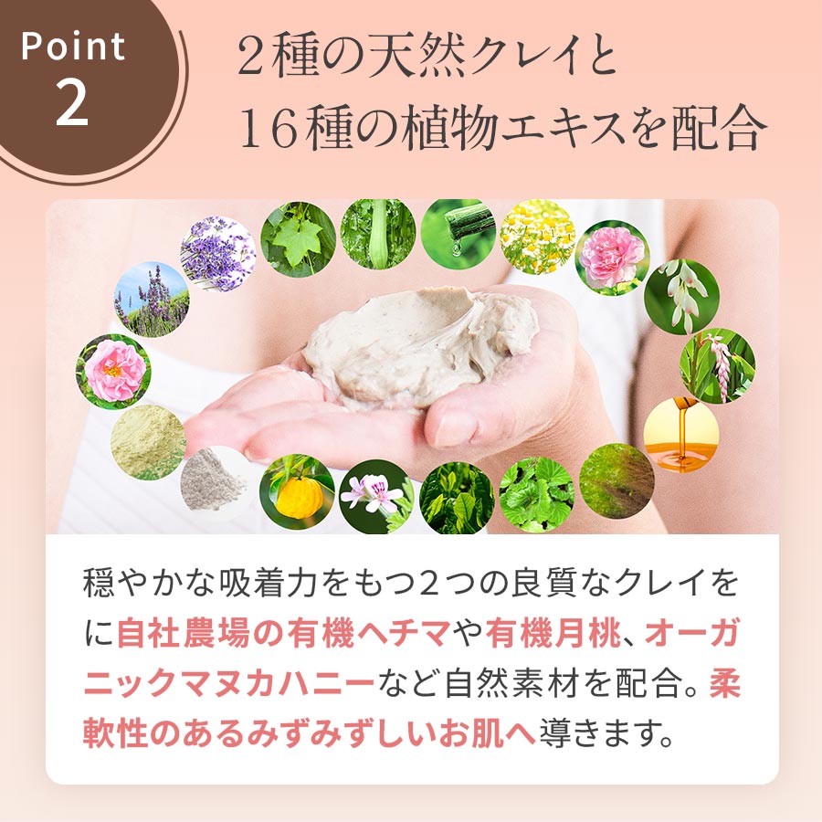 数あるクレイの中でも、比較的穏やかな吸着力をもつ2つの良質なクレイを配合。他に自社農場の有機ヘチマや有機月桃、オーガニックマヌカハニーなど、質にこだわった16種の自然素材が柔軟性のあるみずみずしいお肌へ導きます。