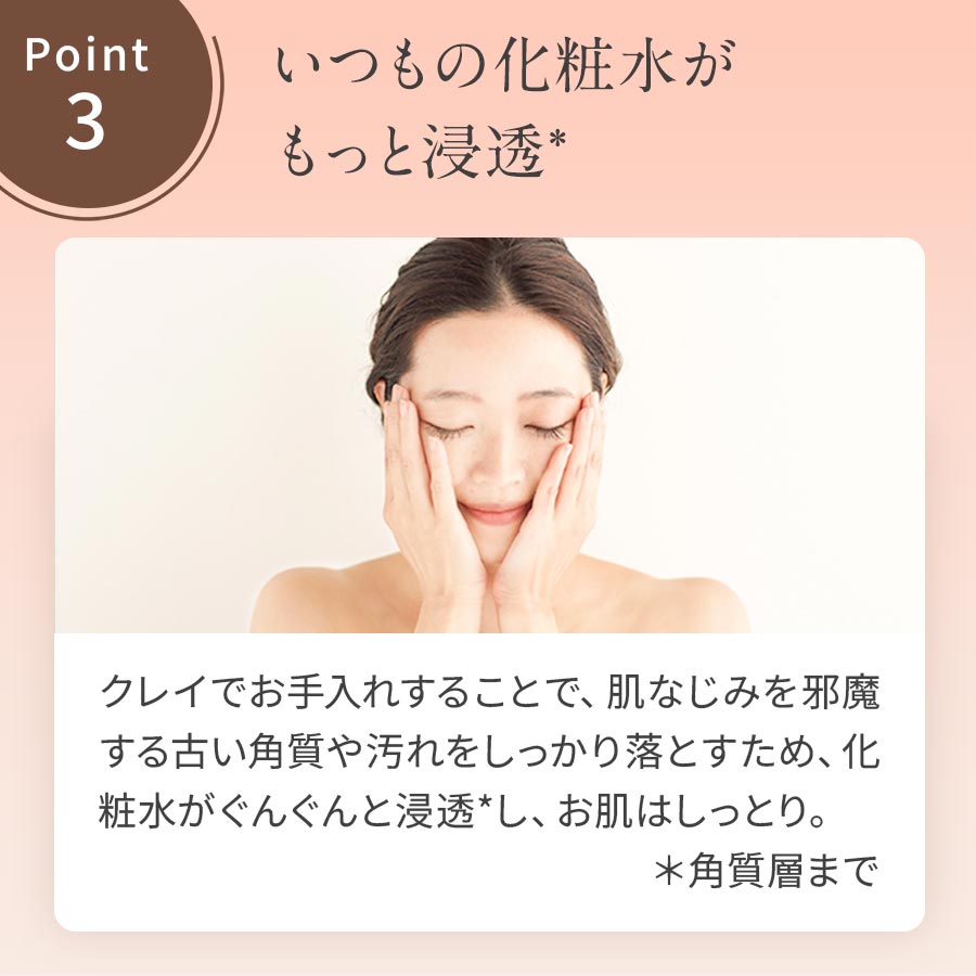 クレイでお手入れ後、化粧水をなじませるとぐんぐんと浸透*し、お肌はしっとり。くすみの原因となったり、肌なじみを邪魔する古い角質や汚れをしっかり落としたためです。その他にも、肌質や季節でべたつく時は、クレイを洗顔料に少々混ぜることで、すべすべな肌に仕上がります。