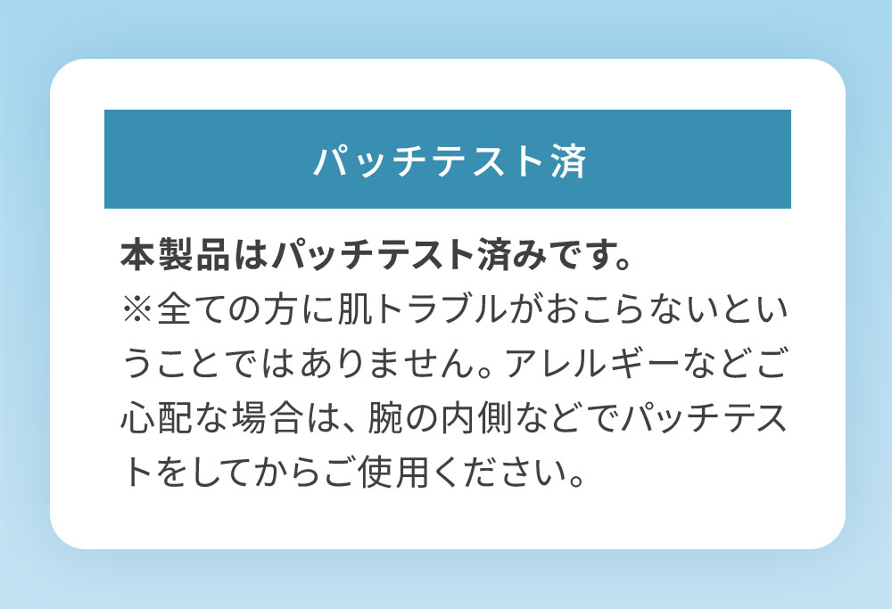 ※すべての方に肌トラブルがおこらないということではありません。アレルギーなどご心配な場合は、腕の内側などでパッチテストをしてからご使用ください。