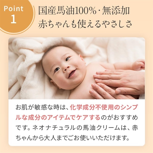 そんなお悩みを解決するのが、『ネオナチュラル馬油クリーム+』。質の高い国産馬油を丁寧に精製し、100%使用した究極のピュア馬油クリームが乾燥ダメージや花粉による刺激をケアし、もっちり潤う肌を保ちます。