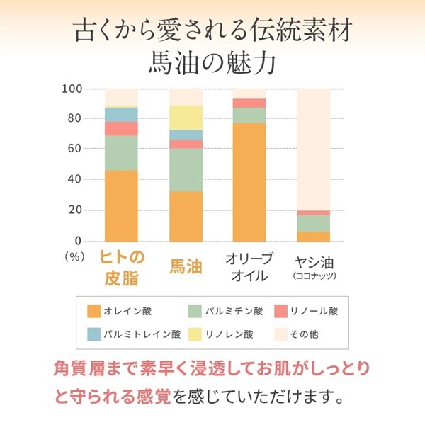 さらに、融点(溶けはじめる温度)が異なる2種類の馬油をブレンドすることにより、角質層まで素早く浸透してお肌がしっとりと守られる感覚を感じていただけます。