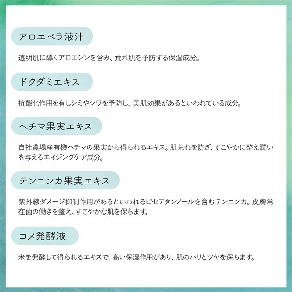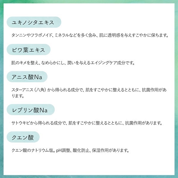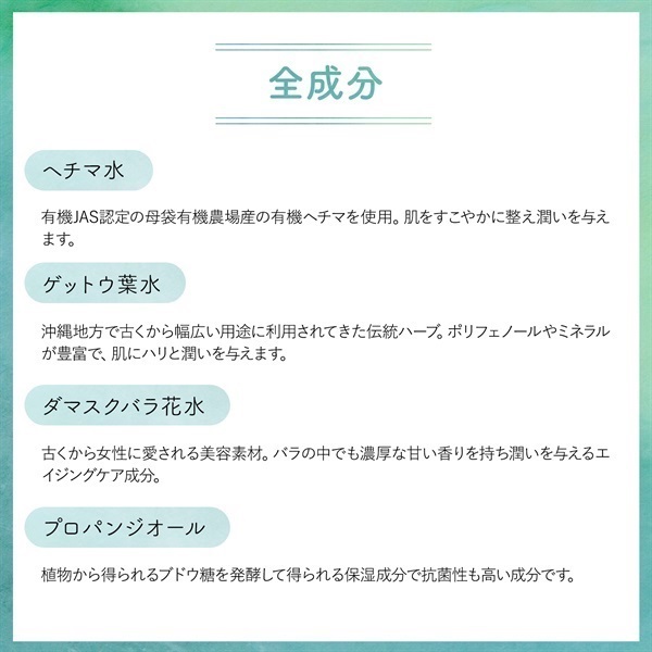 【全成分】ヘチマ水、ゲットウ葉水、ダマスクバラ花水、プロパンジオール、アロエベラ液汁、ドクダミエキス、ヘチマ果実エキス、テンニンカ果実エキス、コメ発酵液、ユキノシタエキス、ビワ葉エキス、アニス酸Na、レブリン酸Na、クエン酸