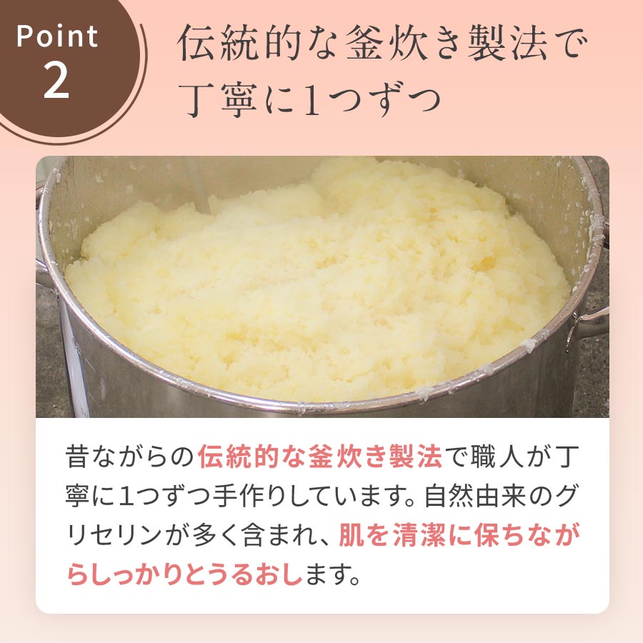 現在主流の、保湿成分を除去して生産効率を上げる製法ではなく、国産馬油と植物成分を使った伝統的な釜炊き製法で手作りしています。気候などの影響を受けやすいため、職人が試食により品質を見極め、微調整。自然由来成分100%で食べられるほどやさしいのが特徴です。