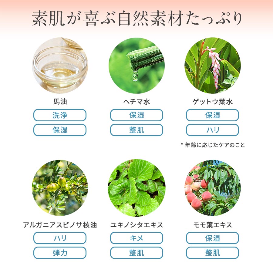 長きにわたり、スキンケア素材として使われてきた自然素材は、肌なじみがよく、その効果や安全性もとても高いと考えられるからです。その中心となるのが、1,000年以上も前から何千万人もの人がスキンケアに使用してきたヘチマや馬油などです。