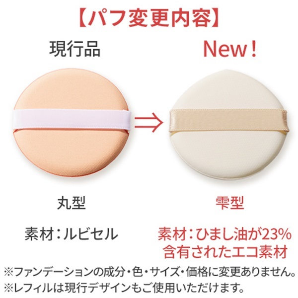 パフのみ、素材がひまし油を23%含有されたエコ素材に、形が丸型から雫型へと変わります。