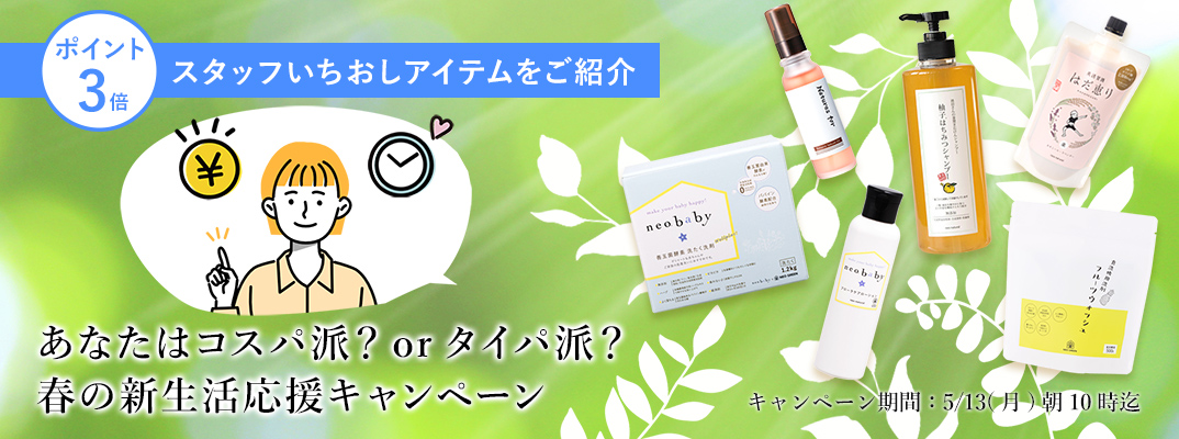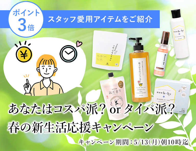 新生活をスタートする方も多い季節。慌ただしくなりがちな毎日を楽しく快適に過ごせるよう、「コスパ=オトク」・「タイパ=時短」にすぐれたオーガニックなアイテムで応援します!